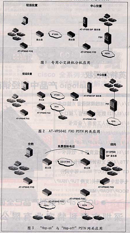 在圖2所示的應用中,遠程局位置直接附加了一個AT-VP504E FXO裝置,為PSTN提供IP電話網(wǎng)關(guān)服務,IP語音呼叫被轉(zhuǎn)化為模擬格式通過標準電話線路進行傳輸。同樣,來自普通電話網(wǎng)絡的呼入呼叫,也被轉(zhuǎn)化為IP呼叫通過企業(yè)IP網(wǎng)絡轉(zhuǎn)接。這就使本地PSTN呼叫者,可向企業(yè)或其他目的地打免費長途電話。