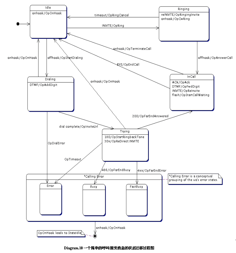 我們根據SIP協(xié)議來定義一下一個發(fā)起呼叫或者是等待接收一個呼叫的狀態(tài)遷移過程:
