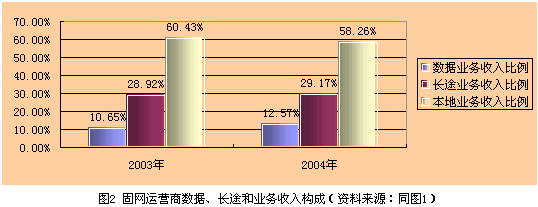 目前數(shù)據(jù)業(yè)務收入與話音業(yè)務收入相差懸殊,通過發(fā)展數(shù)據(jù)業(yè)務彌補VoIP造成的話音收入損失尚需時日。以固網(wǎng)運營商為例,2003年和2004年數(shù)據(jù)業(yè)務、長途業(yè)務和本地業(yè)務收入構成見圖2所示。
