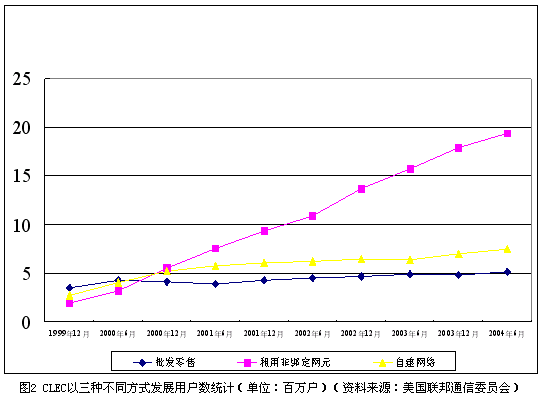 從經(jīng)營模式上看,本地非主導(dǎo)運(yùn)營商的商業(yè)模式在過去的5年中發(fā)生了很大變化。在市場(chǎng)剛剛開始引入競(jìng)爭(zhēng)的1999年,42.9%的本地非主導(dǎo)運(yùn)營商選擇了批發(fā)零售這種進(jìn)入門檻相對(duì)較低的商業(yè)模式,本地電話市場(chǎng)一度活躍著大量地區(qū)性的小運(yùn)營商。由于面臨本地主導(dǎo)運(yùn)營商的強(qiáng)烈抵制,非綁定網(wǎng)元政策的實(shí)施自公布以來一再推遲,經(jīng)過反復(fù)的法律訴訟,美國最高法院在2002年最終裁定非綁定網(wǎng)元政策合法。自那時(shí)起,AT&T、MCI等全國性的長途電話運(yùn)營商紛紛通過租用非綁定網(wǎng)元的方式進(jìn)入本地電話市場(chǎng)。截止到2004年6月,本地主導(dǎo)運(yùn)營商已經(jīng)提供了約2150萬線非綁定本地用戶線給本地非主導(dǎo)運(yùn)營商。CLEC以三種方式發(fā)展用戶的情況如圖2所示。