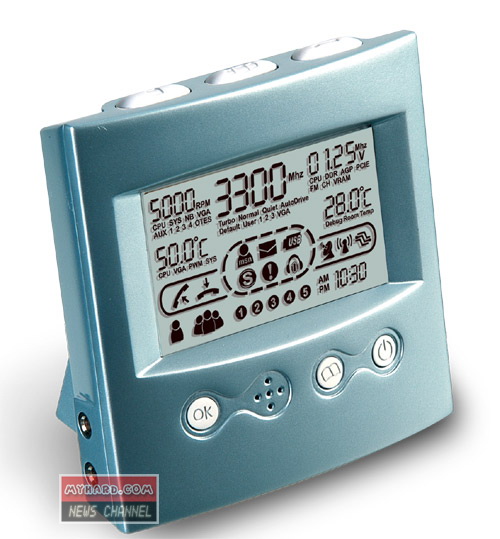 這個(gè)裝置,其實(shí)是一項(xiàng)早期工具的衍生產(chǎn)品。早在2004年,這個(gè)具有獨(dú)立顯示屏的小東西被開發(fā)出來,用以控制電腦的超頻設(shè)定并監(jiān)控系統(tǒng)的效能,F(xiàn)在這個(gè)在下周起于各大通路都買得到的新機(jī)種已納入Skype話務(wù)管理功能,使用者可直接把頭戴式耳機(jī)接到這個(gè)小時(shí)鐘上,one-touch輕輕一按,便可立即進(jìn)行接通電話、速簡撥號及電話會(huì)議。
