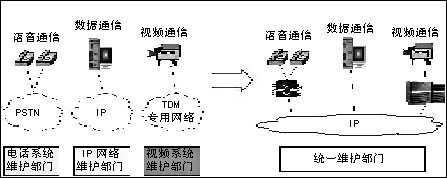 通過IP化改造,原來分別管理IP網(wǎng)絡(luò)和電話網(wǎng)絡(luò)的兩個部門可以有效整合,有助于簡化機(jī)構(gòu)設(shè)置和工作流程,實現(xiàn)對行業(yè)通信系統(tǒng)的統(tǒng)一管理,提高行業(yè)科技部門的工作效率(見圖1)。