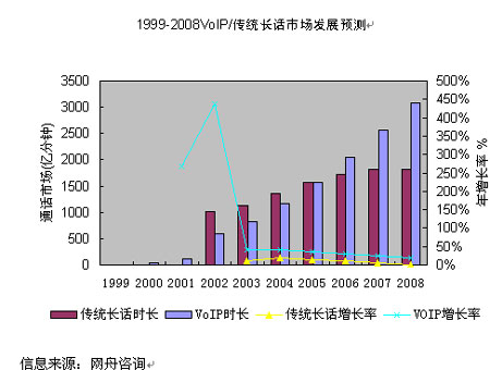 2000年以來,IP長話憑借明顯的資費優(yōu)勢,對傳統(tǒng)長話形成了有力的競爭,在通話量上已趕超了傳統(tǒng)長話。也正是由于IP長話的低資費,在其通話量大幅度增加的同時,也導致了國內(nèi)長話網(wǎng)總體收入的下降,長途電話IP化的趨勢十分明顯?傮w而言,中國VoIP市場仍蘊藏著非常大的潛力,按照3G和NGN的部署速度,