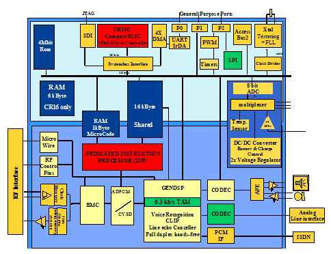 例如,SC14438是一個優(yōu)化了的CMOS芯片,能夠進(jìn)行DECT(1.9GHz)內(nèi)或2.4GHz ISM數(shù)字頻帶手機(jī)內(nèi)需要的所有音頻、信號及數(shù)據(jù)處理。一個ADPCM代碼轉(zhuǎn)換器,一個低功耗的編解碼器(CODEC)及模擬前端被集成于該芯片中,提供麥克風(fēng)與(動態(tài)的)揚(yáng)聲器之間直接的連接。同時還整合了雙工免提操作。SC14438的設(shè)計適用于任一無線產(chǎn)品設(shè)計。一個專用的TDMA控制器能夠處理所有的物理層時隙和無線控制。美國國家半導(dǎo)體公司的標(biāo)準(zhǔn)小型RISC