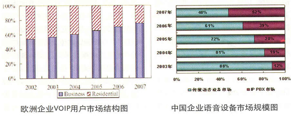 PBX設(shè)備市場(chǎng)規(guī)模在2007年將一舉超過(guò)傳統(tǒng)的PBX市場(chǎng),IP通信的大規(guī)模部署和對(duì)傳統(tǒng)語(yǔ)音系統(tǒng)的替代已經(jīng)不可動(dòng)搖。