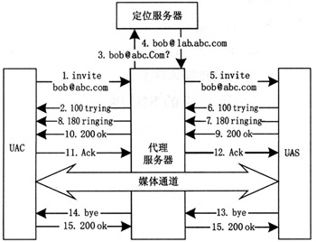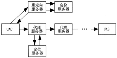如圖2所示,SIP網(wǎng)絡采用IP網(wǎng)絡常用的客戶機/服務器(C/S)結構,定義了若干種不同的服務器和用戶代理,通過與服務器之間的請求和響應完成呼叫和傳送層的控制。