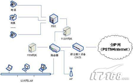 IP-PBX或者分組語音交換(PVX),以及綜合接入設(shè)備(IAD),從而取代傳統(tǒng)的PBX和終端。IAD通常支持基于DSL的業(yè)務(wù),因此部署時(shí)不需要多個(gè)物理線路的開銷,因?yàn)橐粭l來自IAD的物理線路能夠支持多個(gè)虛擬電路。PVX可以處理各種分組話音服務(wù),而且可以避免升級和互操作性的問題。