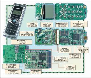 Wi-Fi功能由科勝訊(Conexant)的Prism3 802.11b芯片組完成,是一款傳統(tǒng)的專業(yè)方案?苿儆嵧ㄟ^收購GlobeSpan-Virata得到Prism3 802.11b,而GlobeSpan-Virata之前購買了Intersil的Wi-Fi芯片組業(yè)務(wù),所以Prism3組件仍打著Intersil的標識。以目前的標準看,Prism3總體Wi-Fi方案的集成度不算太高。ISL3871基帶/媒體存取控制芯片與ISL3684收發(fā)器相連,一款獨立的壓控振蕩器和一個RF功放(ISL3084和ISL3984)共同支持ISL3684完成工作。適中的256KB SRAM和128KB閃存滿足該設(shè)計中802.11b部分對存儲器的需要。
