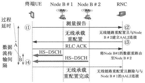 對(duì)于下面的延時(shí)分析,我們假設(shè)信令無線承載(SRB)在下行映射到HS-DSCH信道上,在上行映射到增強(qiáng)上行鏈路專用信道(E-DCH)上,且TTI均為10ms。HS-DSCH是HSDPA的傳輸信道,E-DCH是HSUPA的傳輸信道。首先,當(dāng)滿足測(cè)量觸發(fā)事件1d(最優(yōu)小區(qū)改變)時(shí),UE在信令無線承載上發(fā)送測(cè)量報(bào)告。傳輸從t1開始,RNC在t2時(shí)刻接收到消息。服務(wù)RNC將為目標(biāo)NodeB保留基站資源和Iub資源。該資源的預(yù)留通過使用預(yù)配置可以完成得非?臁R坏┵Y源在t3時(shí)刻準(zhǔn)備好,RNC將向UE發(fā)送無線承載重配置消息,此時(shí)UE還是從源NodeB中接收數(shù)據(jù)。當(dāng)UE對(duì)重配置消息進(jìn)行解碼,并且在有效時(shí)刻t4到期前,UE接收數(shù)據(jù)將從源小區(qū)切換到目標(biāo)小區(qū)。UE開始監(jiān)聽目標(biāo)小區(qū)的高速共享控制信道(HS-SCCH),HS-SCCH是HSDPA下行的共享控制信道。UE也會(huì)測(cè)量目標(biāo)小區(qū)的信道質(zhì)量,并發(fā)送目標(biāo)小區(qū)的CQI報(bào)告。源小區(qū)該用戶的MAC-hs在小區(qū)切換后將重置,并將緩存的協(xié)議數(shù)據(jù)單元(PDU)刪除。同時(shí)目標(biāo)小區(qū)MAC-hs中的流控單元開始從服務(wù)RNC中請(qǐng)求PDU,這樣便可以通過HS-DSCH向用戶發(fā)送數(shù)據(jù)。在小區(qū)切換過程中,RNC可以同時(shí)向兩個(gè)Node