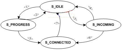 “S_IDLE”狀態(tài)就是我們通常所說的待機狀態(tài)。當用戶撥打?qū)Ψ降腟IPURI,協(xié)議棧通過發(fā)送INVITE請求消息,得到臨時響應(yīng)消息,呼叫就處于“S_PROGRESS”,圖中箭頭<1>表示該操作引起的狀態(tài)切換。在“S_PROGRESS”狀態(tài),對方如果拒絕接受呼叫,狀態(tài)又返回“S_IDLE”,如箭頭<2>;當對方接受呼叫,就處于連接通話狀態(tài)“S_CONNECTED”,如箭頭<5>。在“S_IDLE”狀態(tài)也可能收到對方的呼叫請求,當UA應(yīng)用發(fā)現(xiàn)一個新的呼叫請求,就應(yīng)當切換狀態(tài)到“S_INCOMING”,如箭頭<3>;同樣,用戶可以拒絕接受呼叫,狀態(tài)切換回“S_IDLE”,如箭頭<4>;當用戶接受呼叫請求,呼叫狀態(tài)就處于“S_CONNECTED”。在“S_CONNECTED”狀態(tài),通話雙方任何一方的結(jié)束通話請求都會導(dǎo)致狀態(tài)返回“S_IDLE”,結(jié)束通話。