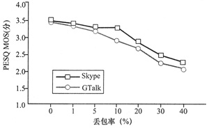 MOS方法評估了它們語音質(zhì)量的優(yōu)劣。通過實驗可知:在理想的網(wǎng)絡(luò)狀況下,Skype表現(xiàn)得更好一些(兩者PESQ MOS的分數(shù)差別為0.1),總體而言它們的語音質(zhì)量還是較為接近。在網(wǎng)絡(luò)有較長的時延時,Skype有不必要的適應(yīng)性。當(dāng)丟包情況發(fā)生時,GTalk沒有實施任何機制來提高其性能,與此同時,Skype使用數(shù)據(jù)冗余機制來對抗丟包以提高其語音質(zhì)量。在抖動情況發(fā)生時,兩者都沒有很好的機制來提高其適應(yīng)性。當(dāng)有較長的時延時,PESQ