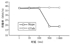 ms時通話是可以接受的,時延為500 ms、1 000 ms時語音質(zhì)量就變得不可接受。對于Skype,時延對其服務質(zhì)量的影響更為明顯,如圖5所示,傳輸率從37.5