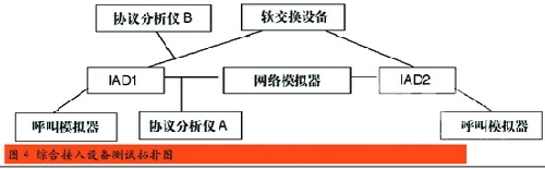 我國通信行業(yè)國家標(biāo)準(zhǔn)《基于軟交換的綜合接入設(shè)備測試方法》中明確了IAD設(shè)備九個大項的測試,分別是基本功能測試、協(xié)議測試、接口測試、話音業(yè)務(wù)測試、數(shù)據(jù)業(yè)務(wù)測試、性能測試、OAM測試、硬件項目測試和環(huán)境測試。按照圖4所示的測試拓撲圖進行連接,就可以按照測試方法中的測項要求,逐一得出測試結(jié)果。