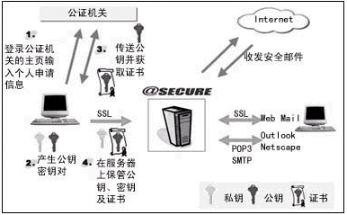 簡單來說,PKI就是由發(fā)布機(jī)構(gòu)發(fā)布證書給PKI的用戶,證書中含有用戶公共密鑰和個人密鑰的信息,由證書、證書授權(quán)機(jī)構(gòu)CA和實體三部分組成。PKI的用戶利用個人密鑰簽發(fā)信息或解密收到的信息,而其他用戶則使用對應(yīng)公共密鑰收發(fā)信息;赑KI的設(shè)計,采用統(tǒng)一的證書分配、管理策略以及共同的可靠性驗證機(jī)制,一方面可以保證E-mail的安全性,另一方面還可以解決現(xiàn)有不同系統(tǒng)無法進(jìn)行通信的弊病。因此,現(xiàn)有推出的一些優(yōu)秀E-mail系統(tǒng)如3R Soft推出的@SECURE都是基于PKI進(jìn)行設(shè)計的。通過數(shù)據(jù)加密的辦法只能保證郵件的機(jī)密性,卻無法完全保證郵件的完整性和不可抵賴性,即不能保證郵件在傳輸過程中不被他人篡改,且不被人冒名頂替發(fā)送。數(shù)字簽名可以有效地阻止這一現(xiàn)象,即在發(fā)送E-mail的同時,加上一個Hash冗余信息。發(fā)送者使用Hash函數(shù)創(chuàng)建信息的摘要,作為信息數(shù)字指紋,然后用個人密鑰加密信息摘要,加密后的信息摘要就是數(shù)字指紋。目前較為常用的,如在 @SECURE 中采用的MD5算法,它是一種單向散列算法,大小為128比特,經(jīng)計算,它被仿制的概率小于1/265,符合安全性的需要。