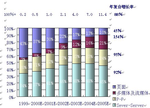 同時,人們對P-P的互動及多媒體的傳輸?shù)男枨髮⒊蔀榫W(wǎng)絡使用的2個最主要的發(fā)展趨勢。據(jù)麥肯錫公司和JP摩根的分析和預測,多媒體及流媒體的IP流量將以每年154%的復合率增長,而P—P的IP流量將以95%的年復合增長率增長,這2項將成為用戶需求增長最快的業(yè)務。如下圖,