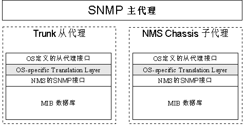 SNMP采用了Client/Server模型的特殊形式:代理/管理站模型。對網(wǎng)絡的管理與維護是通過管理工作站與SNMP代理間的交互工作完成的。每個SNMP從代理負責回答SNMP管理工作站(主代理)關于MIB定義信息的各種查詢。下圖10是NMS公司網(wǎng)絡產(chǎn)品中SNMP協(xié)議的實現(xiàn)模型。