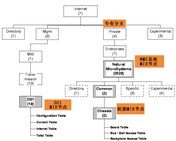 下圖給出了NMS系統(tǒng)中SNMP可訪問網(wǎng)絡設備的對象識別樹(OID:Object Identifier)結(jié)構(gòu)。
