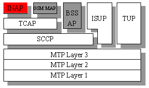 智能網的通信采用SS7信令,SS7信令系統(tǒng)中的智能網應用部分(INAP)是專門用于智能網通信的。INAP是建立在TCAP和SCCP協(xié)議層之上的,在下面SS7協(xié)議棧中可以看出INAP在SS7協(xié)議棧中所處的位置: