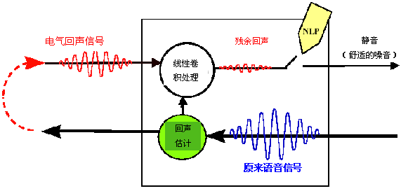 符合ITU G.168(2000)標(biāo)準(zhǔn)的回聲消除器能夠消除電氣(混合)回聲。這類設(shè)備在其運(yùn)行當(dāng)中采用了"兩段式"方法。在第1階段,使用線性卷積處理消除了大部分回聲。在第2階段,采用了非線性處理器(NLP)以消除殘存的回聲,這一部分相對(duì)較小。對(duì)殘存回聲信號(hào)的辨識(shí)是一件很簡(jiǎn)單的任務(wù),這是因?yàn)樗墓β孰娖矫黠@低于原始的語(yǔ)音信號(hào)。