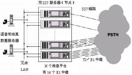 圖6所示為一個運營級的聲訊平臺,這是個面向公眾的開放結(jié)構(gòu)增強業(yè)務(wù)平臺。系統(tǒng)由多臺計算機(或叫節(jié)點)組成,節(jié)點間通過以太網(wǎng)相連接以提供冗余功能,這是一個很規(guī)范、具有很高可靠性的系統(tǒng)。在這一例子中,兩個SS7節(jié)點用于為應(yīng)用提供信令,而其它幾個媒體節(jié)點用于提供和PSTN間的通道連接和呼叫處理功能,包括所有和用戶的音頻或聲音對話,以及信息播放。每個媒體節(jié)點一般使用有一定數(shù)量的線路和DSP資源的板卡,比如NMS