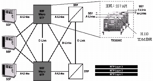 微型STP連接多條從SSP來的鏈路,并把它們集中到一個連接STP的鏈路集之中,這一鏈路集有兩條鏈路。微型STP到每個SSP也有兩條鏈路組成的一個鏈路集。微型STP由完全相同配置的一對構(gòu)成,以實現(xiàn)高可用性和高可靠性,兩個STP之間用交叉鏈路(C鏈路)相連接。另外,微型STP上的每個端口可以設(shè)置一個唯一的信令點編碼,以便移除SS7鏈路時不影響端點SSP。