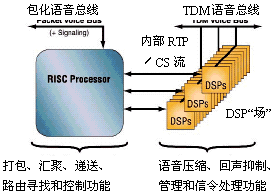 圖2畫出了第一代VoP網(wǎng)關(guān)典型的基于處理器的實現(xiàn)框圖,圖中利用通用DSP"場"來實現(xiàn)所有具體的DSP功能,利用通用RISC處理器來打包、匯聚和分發(fā)/路由尋找。(請參看補充材料<VoP技術(shù)>一文)。