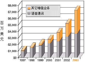 為了獲得競(jìng)爭(zhēng)優(yōu)勢(shì),業(yè)務(wù)提供商──傳統(tǒng)長(zhǎng)途運(yùn)營(yíng)和本地交換運(yùn)營(yíng)商,因特網(wǎng)業(yè)務(wù)提供商(ISP),應(yīng)用業(yè)務(wù)提供商,以及無(wú)線(xiàn)運(yùn)營(yíng)商──都在想方設(shè)法發(fā)布基于IP的業(yè)務(wù),這些業(yè)務(wù)應(yīng)該:對(duì)用戶(hù)有較高的價(jià)值,能縮短面市所需時(shí)間,部署是低成本高效益的。向用戶(hù)提供高價(jià)值的增值業(yè)務(wù)能為業(yè)務(wù)提供商帶來(lái)重要的收入源泉,并使他們更有特色,增加市場(chǎng)分額,特別是如果這些業(yè)務(wù)以快速、易于支持的方式部署,以上這些優(yōu)勢(shì)就會(huì)更加突出。據(jù)估計(jì),到2003年增值業(yè)務(wù)設(shè)備僅在美國(guó)就能達(dá)到73億美元的市場(chǎng),正如圖1所示。