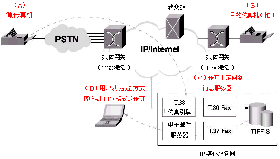 T.38規(guī)定了實(shí)時(shí)IP傳真的標(biāo)準(zhǔn)。因此,源于PSTN的一個(gè)傳真會(huì)話(huà)能夠以T.38的格式進(jìn)入IP網(wǎng)絡(luò)。在IP媒體服務(wù)器中通過(guò)使用T.30,T.38和T.37,實(shí)時(shí)傳真會(huì)話(huà)可以把IP媒體服務(wù)器作為終端,并把實(shí)時(shí)傳真轉(zhuǎn)換成T.37兼容的傳真消息。然后,這個(gè)傳真消息會(huì)被用來(lái)產(chǎn)生一個(gè)就象一個(gè)電子郵件會(huì)話(huà)的T.37傳真。這使得IP媒體服務(wù)器可以提供"永不示忙"的IP傳真功能。這個(gè)功能也將為統(tǒng)一消息應(yīng)用提供基于IP的傳真郵箱能力。