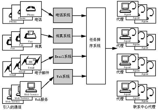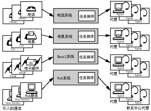 對通信媒體多樣性的支持是非常重要的,其中通信媒體包括電話、交互語音應(yīng)答、email、Web業(yè)務(wù)、傳真以及文件處理。為了處理通信媒體的多樣性,系統(tǒng)可能被分成多個(gè)子系統(tǒng),每個(gè)子系統(tǒng)對應(yīng)一種媒體類型。子系統(tǒng)將輸入的通信信息通知給負(fù)載序列,并且一直保留該通信信息,直到收到負(fù)載序列準(zhǔn)備路由該通信信息的消息。然后子系統(tǒng)按照負(fù)載序列的指令將通信信息發(fā)送到正確的代理坐席或設(shè)備。