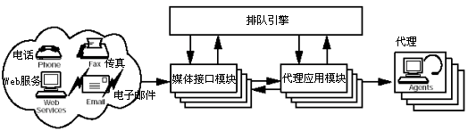 媒體交互模塊是跨媒體隊(duì)列結(jié)構(gòu)的通信入口。聯(lián)系中心所使用的每一種類型的媒體信道都與不同的模塊相關(guān)聯(lián),這些模塊檢測不同各自信道上的用戶請求,并將他們轉(zhuǎn)交給該隊(duì)列引擎。