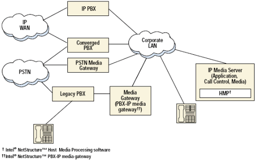 IP座席和IP媒體服務器連接到內部網(wǎng). 公司內部網(wǎng)可以通過PSTN-IP媒體網(wǎng)關來連接PSTNA. 企業(yè)內不斷增加的使用VoIP技術的需求使IP媒體服務器的需求也不斷增加.
