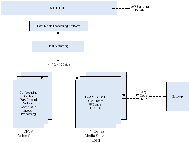 如圖2所示,IPT系列板卡可以通過(guò)H.110總線連接到任何一個(gè)高密度的Dialogic Dialogic DM/V語(yǔ)音系列媒體處理板卡上。開發(fā)商通過(guò)組合IPT系列和DM/V板卡,便可以分發(fā)他們的解決方案,包括語(yǔ)音處理、傳真、講話以及會(huì)議功能,這套解決方案可以使每個(gè)系統(tǒng)可以從數(shù)以百計(jì)的端口升級(jí)到數(shù)以千計(jì)的端口。開發(fā)商也可以選擇使用IPT系列板卡作為高密度接口板卡,并連接到PCI總線使其可以訪問在主機(jī)處理器上執(zhí)行的媒體處理功能。