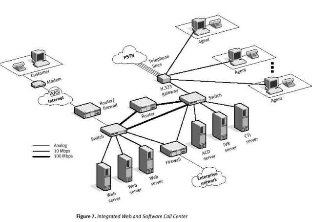 向基于軟件的呼叫中心模型遷移的第一步:通過使呼叫中心具有Web能力,將來自因特網(wǎng)的呼叫接入到現(xiàn)有呼叫中心中。圖5展示了H.323網(wǎng)關(guān)如何轉(zhuǎn)換VoIP呼叫到現(xiàn)有自動(dòng)呼叫分配器(ACD)支持的傳統(tǒng)電話呼叫。這一簡(jiǎn)單步驟,使公司能夠通過基于因特網(wǎng)的電話連接客戶。然而,在客戶所見到的Web頁面和業(yè)務(wù)代表的Web內(nèi)容及CTI數(shù)據(jù)之間,通常既沒有邏輯連接,也沒有物理連接。(CTI數(shù)據(jù)的獲得可能會(huì)通過在客戶的瀏覽器上下載一個(gè)代理或一個(gè)JAVA小程序?qū)崿F(xiàn),通過它發(fā)出客戶的位置等相關(guān)數(shù)據(jù))。因此在大多數(shù)情況下,客戶和業(yè)務(wù)代表在購買或支持過程中通過交談而解決問題。